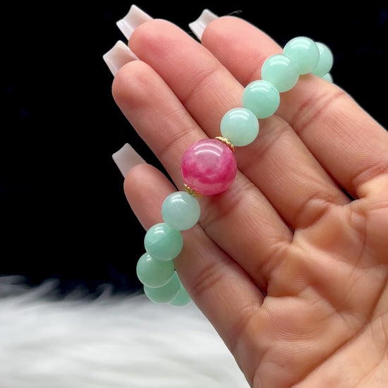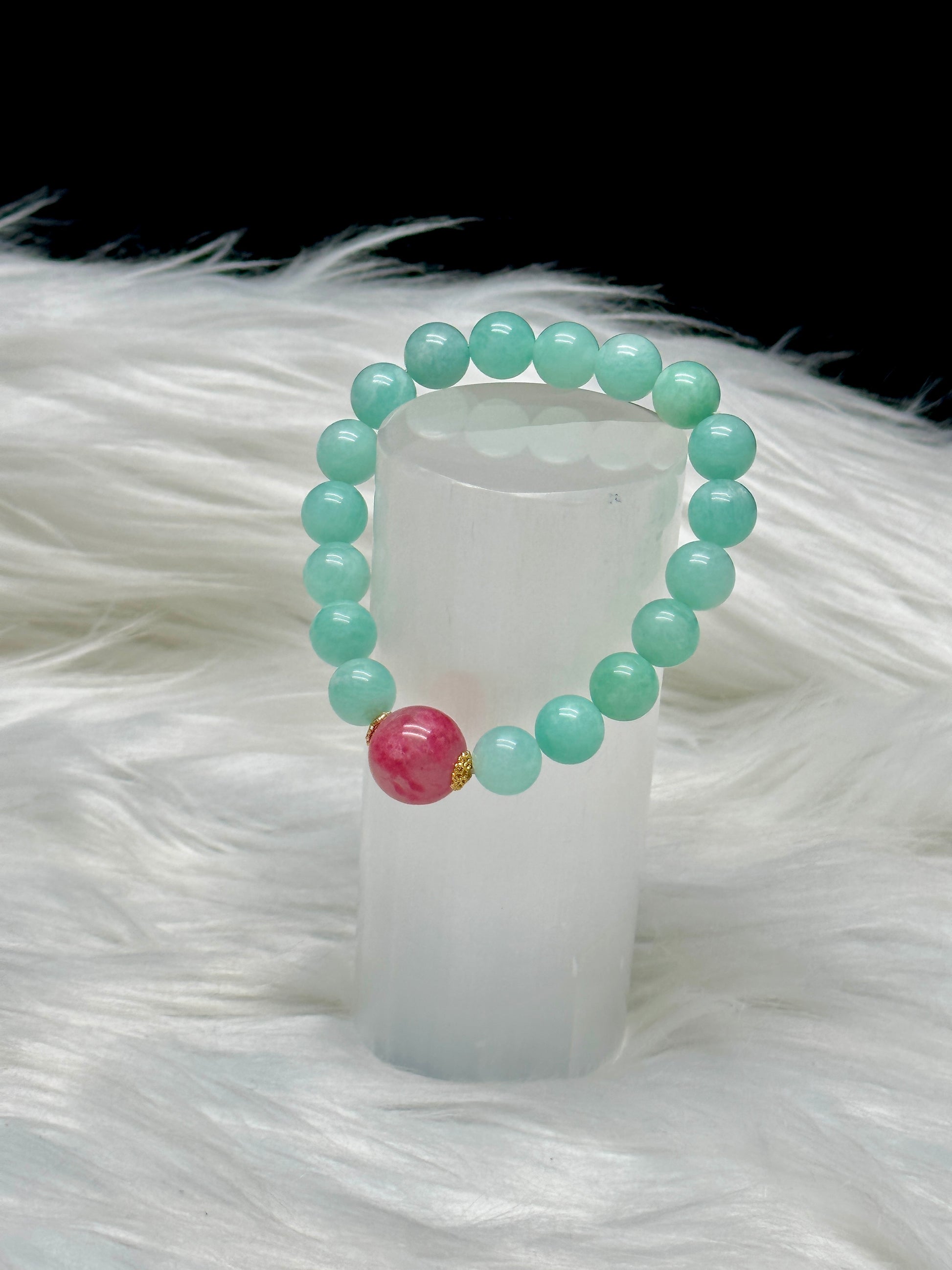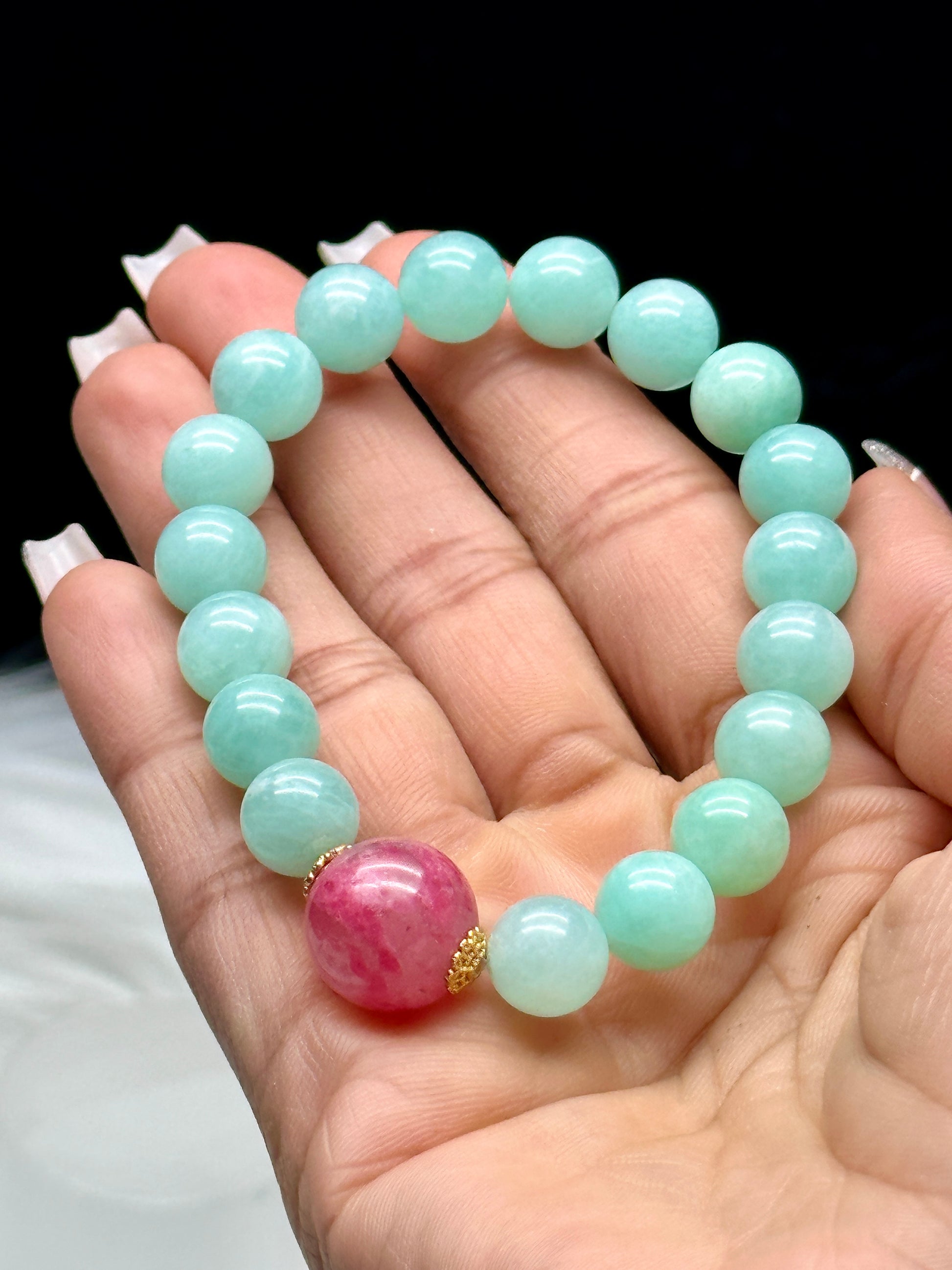 AAA Natural Amazonite Crystal Bracelet with Rhodonite Center Bead – 9mm or 13mm Beads, High-Quality Healing Crystals