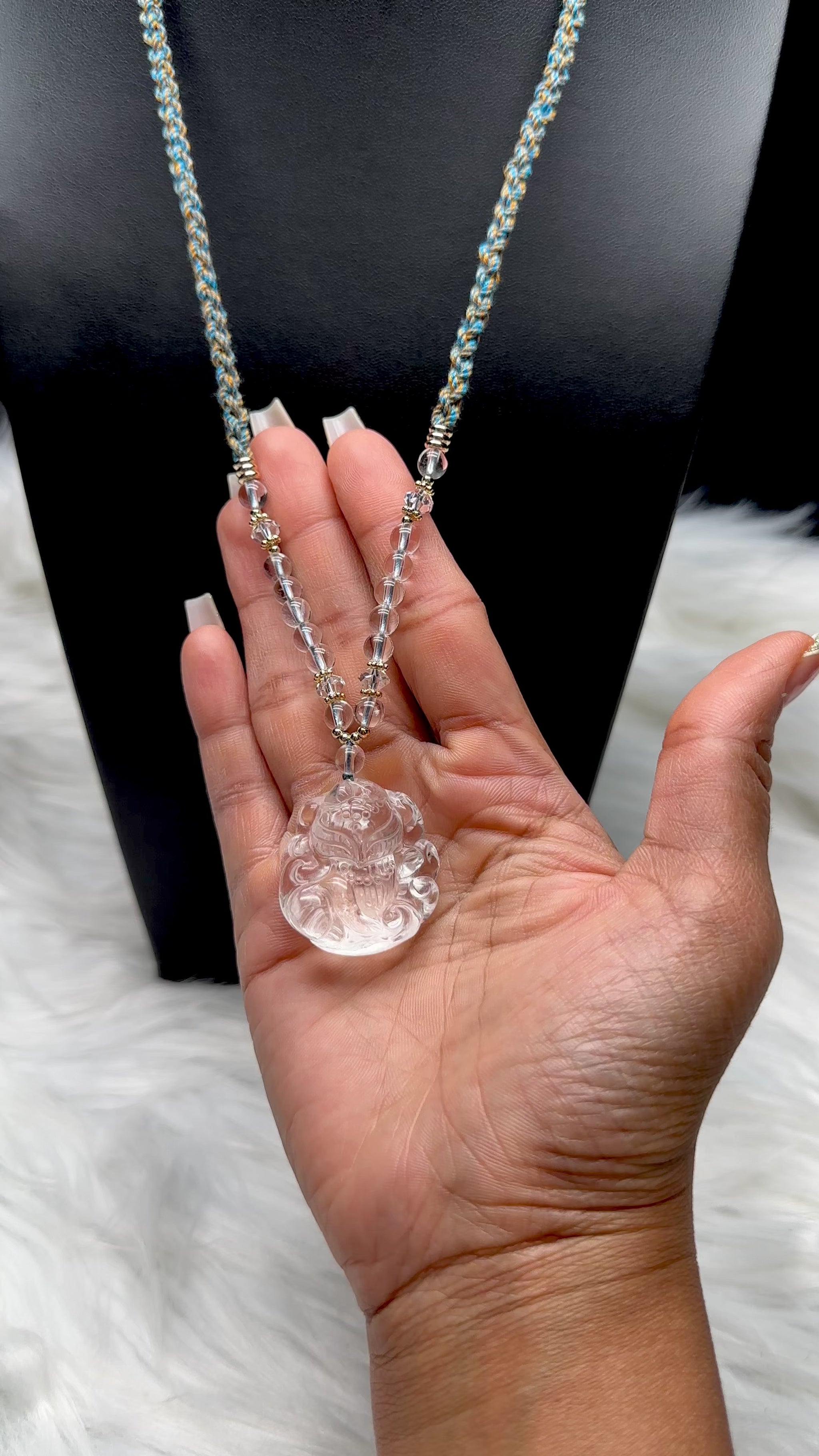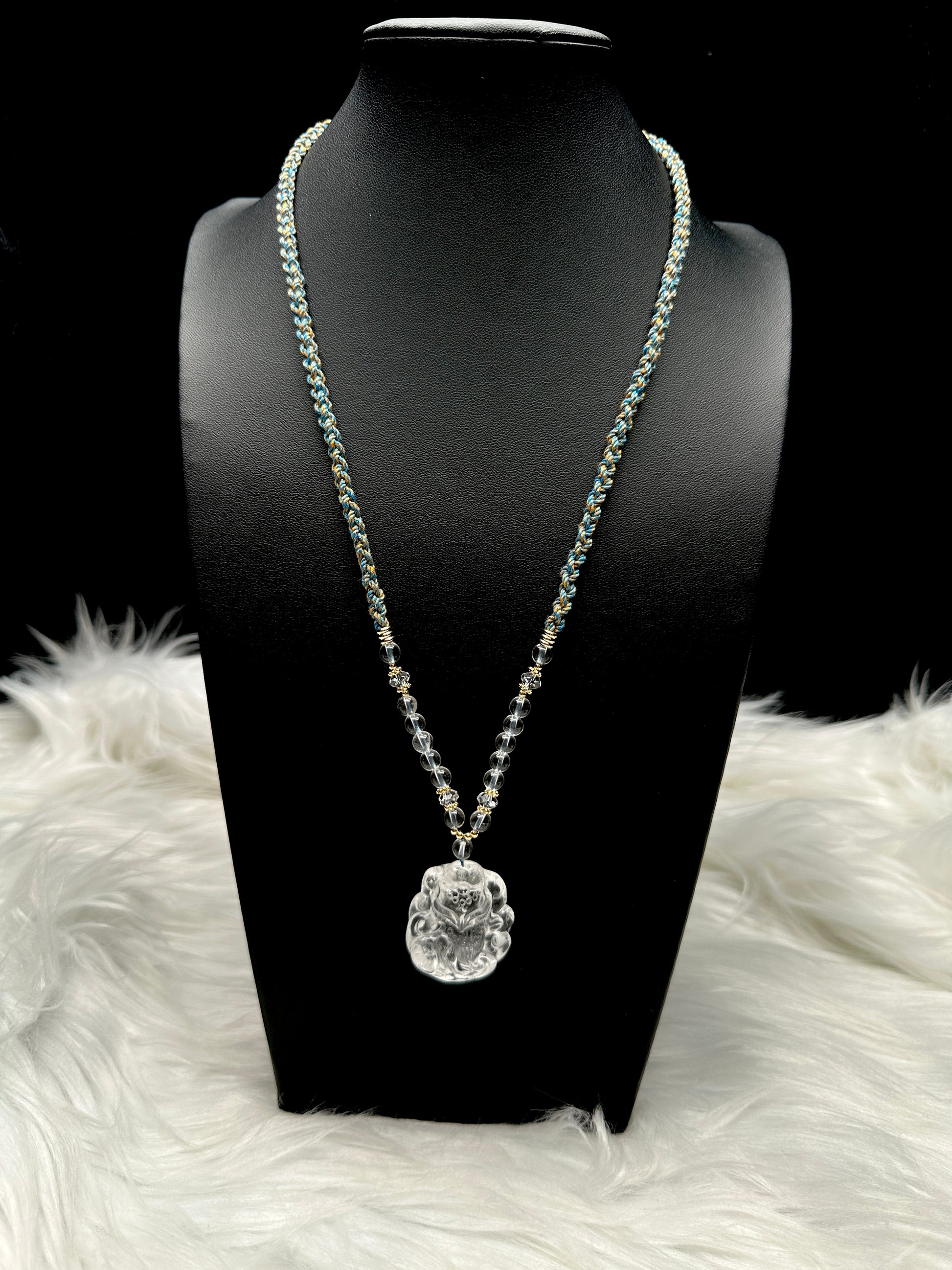 Clear Quartz Bead Necklace with Nine Tail Fox Pendant – Adjustable Thread, Sterling Silver Accents