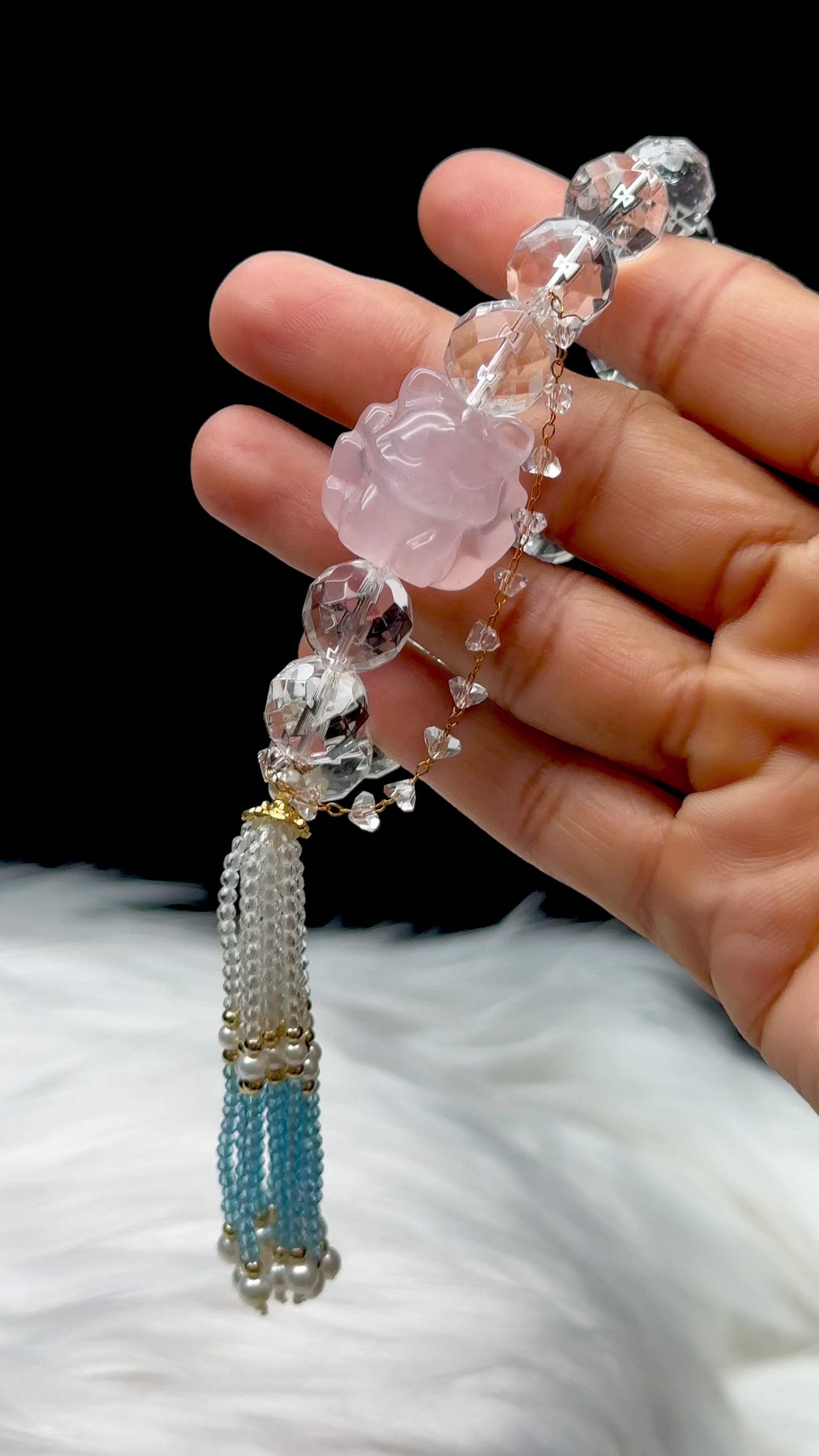 Embrace the magic and beauty of this Clear Quartz Crystal Bracelet with a stunning Rose Quartz Nine-Tail Fox centerpiece! Handcrafted with high-quality 12mm clear quartz beads, this bracelet features sterling silver spacers, and elegant pearl, clear quartz, and aquamarine tassels. The centerpiece, a rose quartz nine-tail fox, symbolizes transformation and love, making this piece not only beautiful but deeply meaningful. The bracelet is crafted with a stretchable cord, making it adjustable to fit most wrist sizes comfortably.