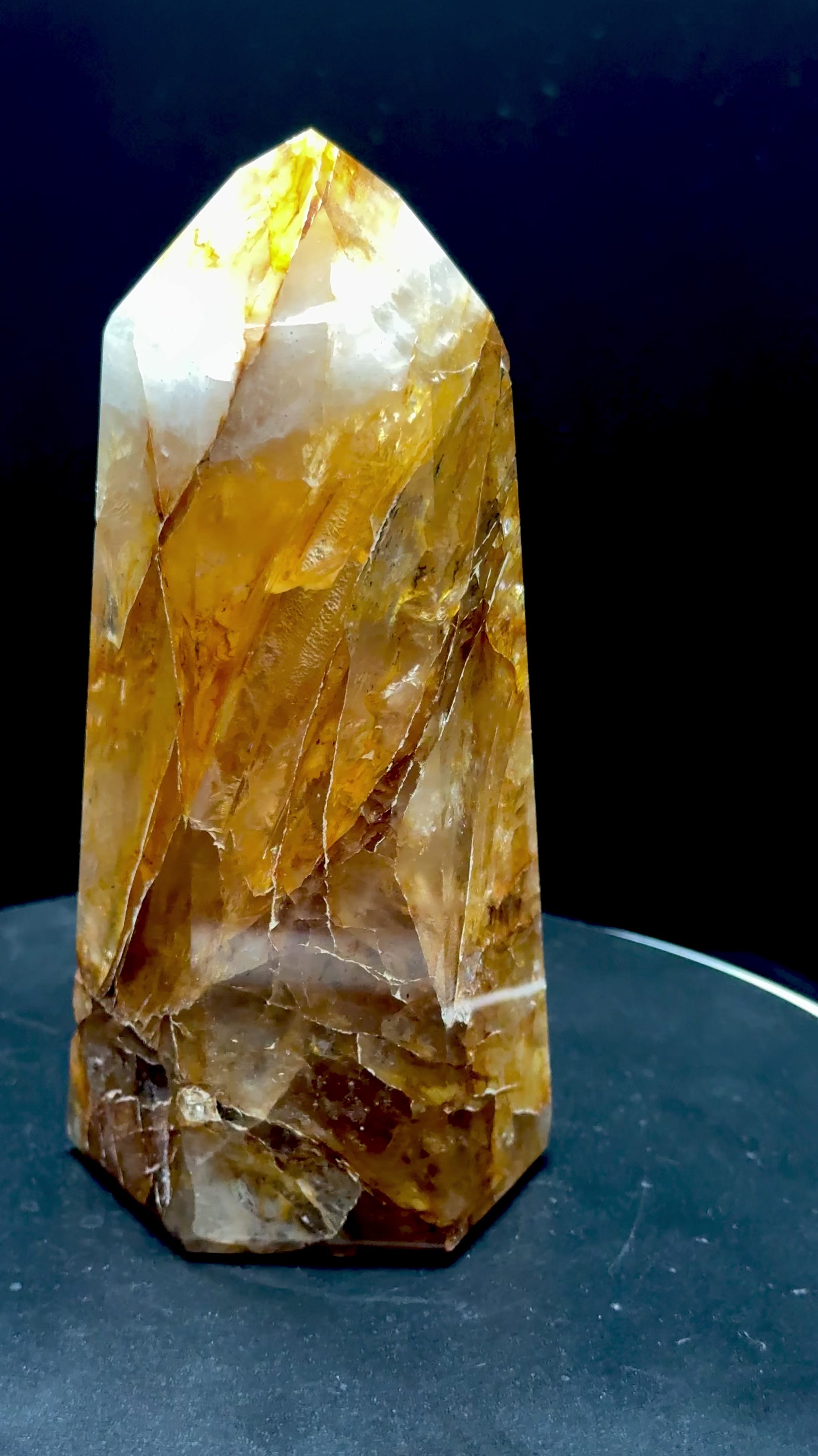 Elevate your space with this Large Golden Healer Quartz Point Tower, a powerful and radiant crystal known for its high vibrational energy and deep healing properties. This one-of-a-kind piece stands 6.4 inches tall and weighs 784 grams, making it an ideal centerpiece for crystal grids, meditation spaces, or home décor.