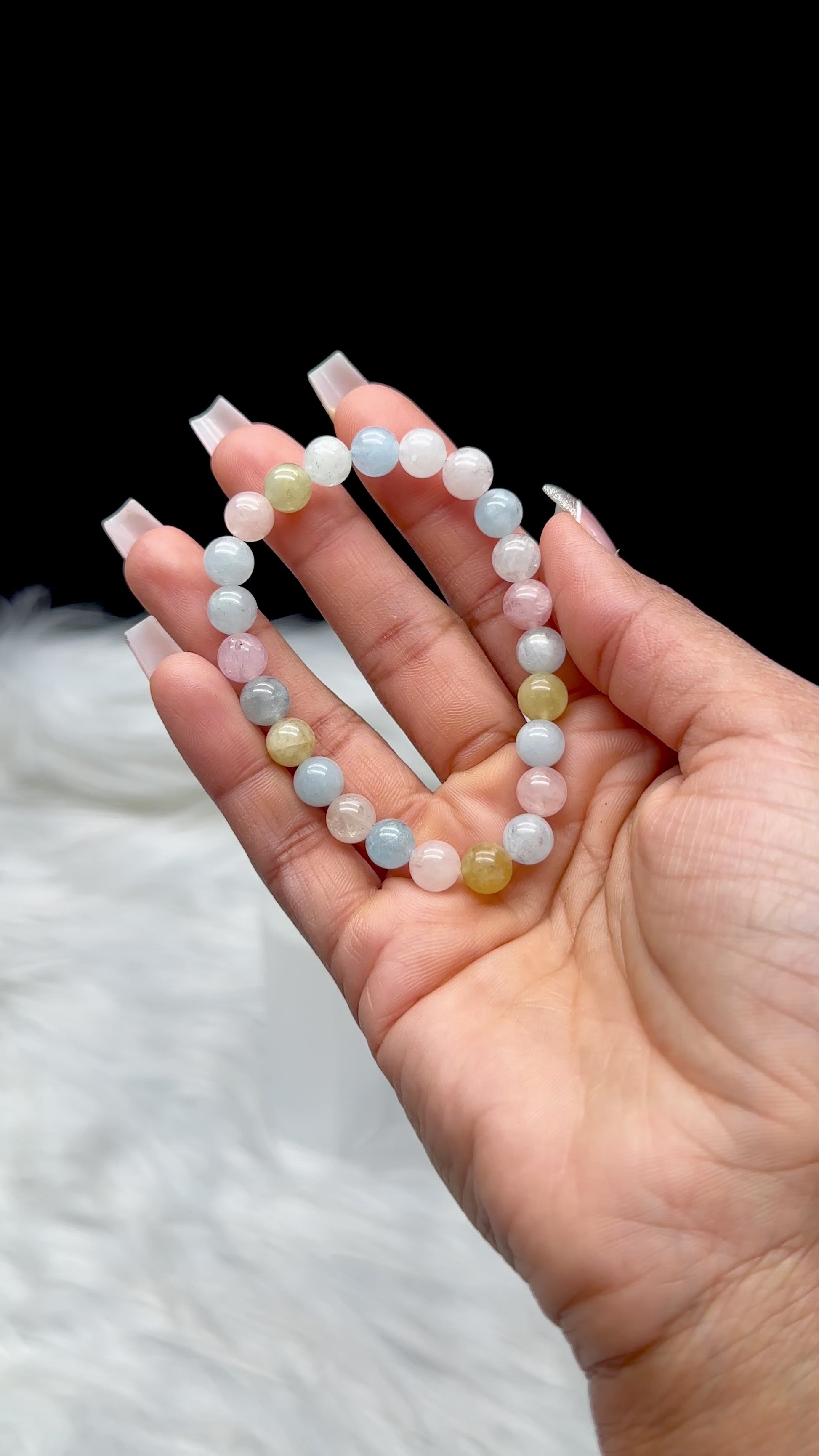 This bracelet is handmade using authentic, high-quality morganite gemstones, and strung on a durable stretch cord for a comfortable fit. The soft pinks and pastels in each bead make it a timeless and meaningful piece of crystal jewelry—perfect for everyday wear, gifting, or meditation.