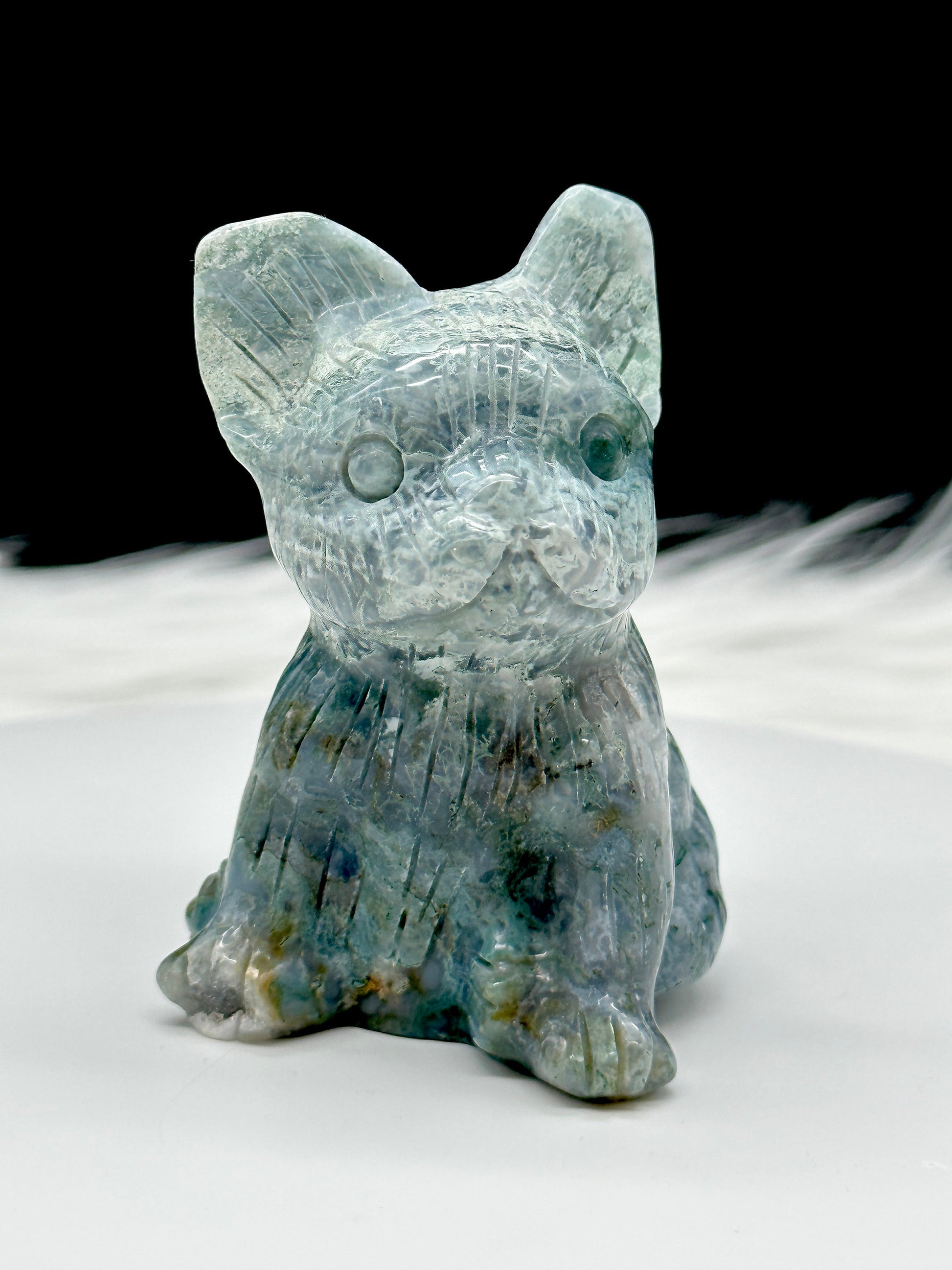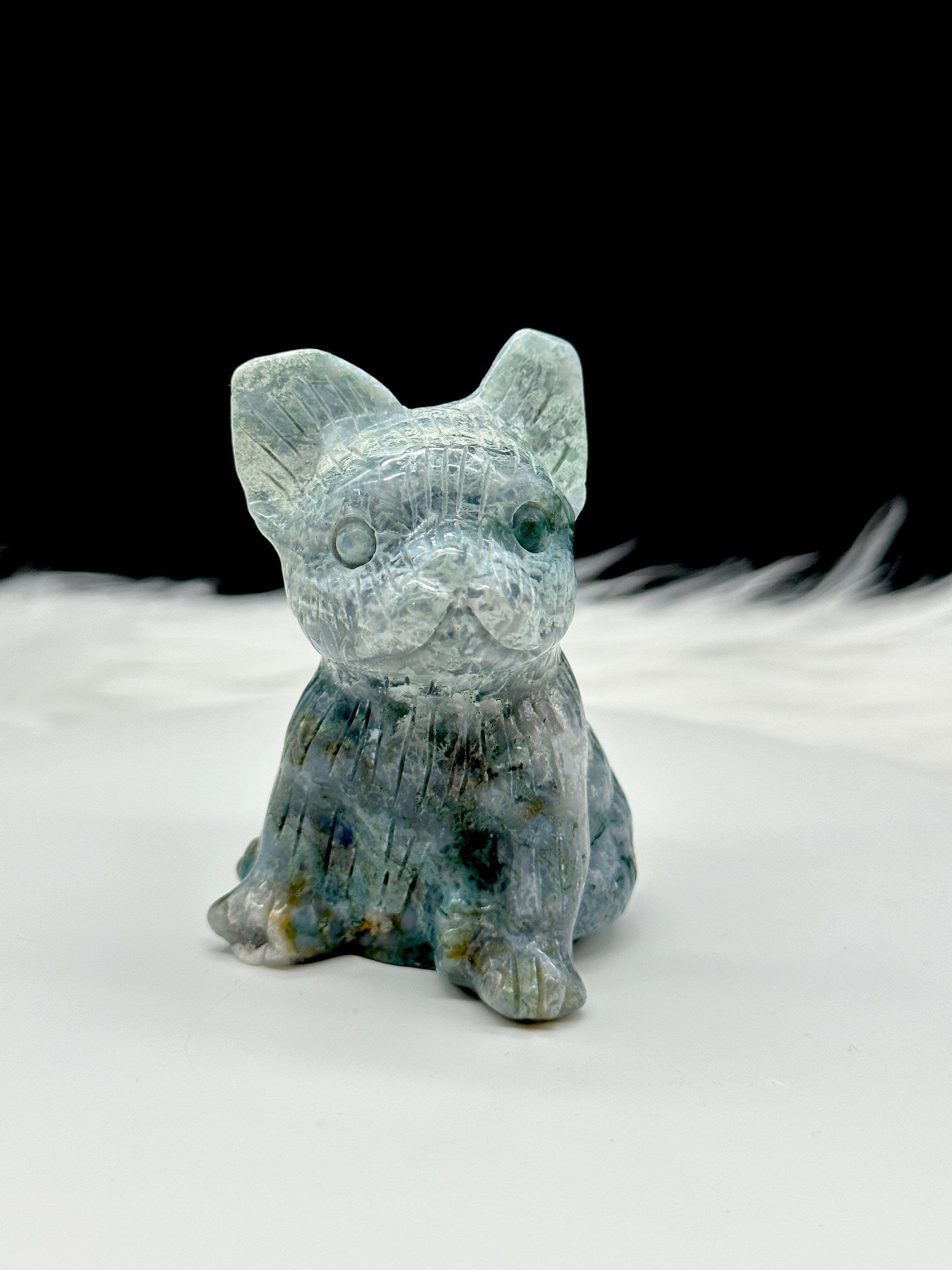 Moss Agate French Bull Dog Carving, Moss Agate Dog, Moss Agate Frenchie French Bulldog Dog Carving,Metaphysical Healing and Home Decor