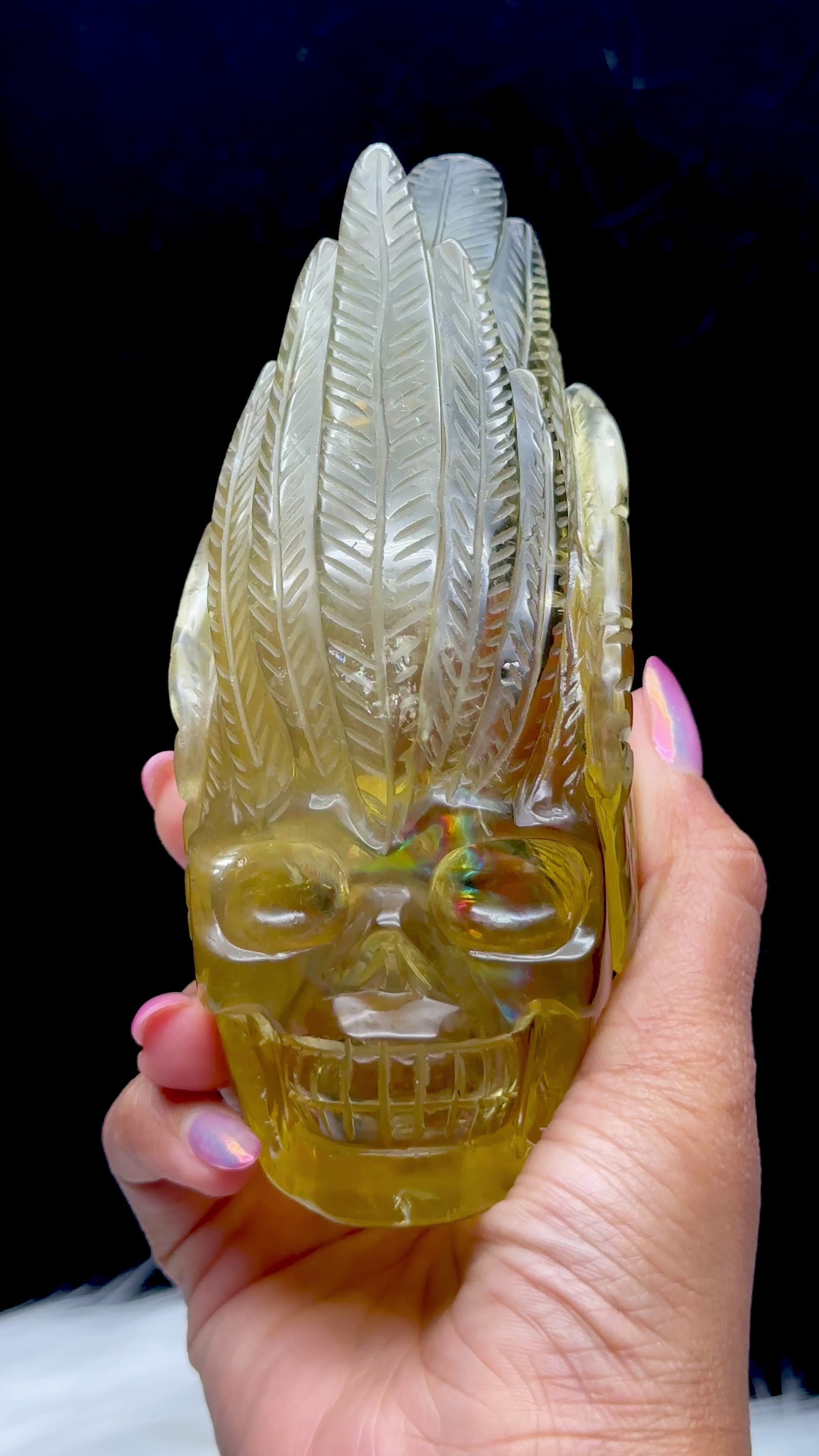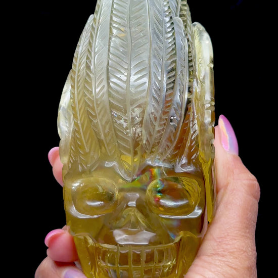 Add a powerful statement piece to your crystal collection with this Rainbow-Filled High-Quality Citrine Feather Head Carved Skull. Expertly carved from genuine, natural citrine, this crystal skull features a detailed feathered headdress design and weighs approximately 725 grams, standing 5 inches tall.