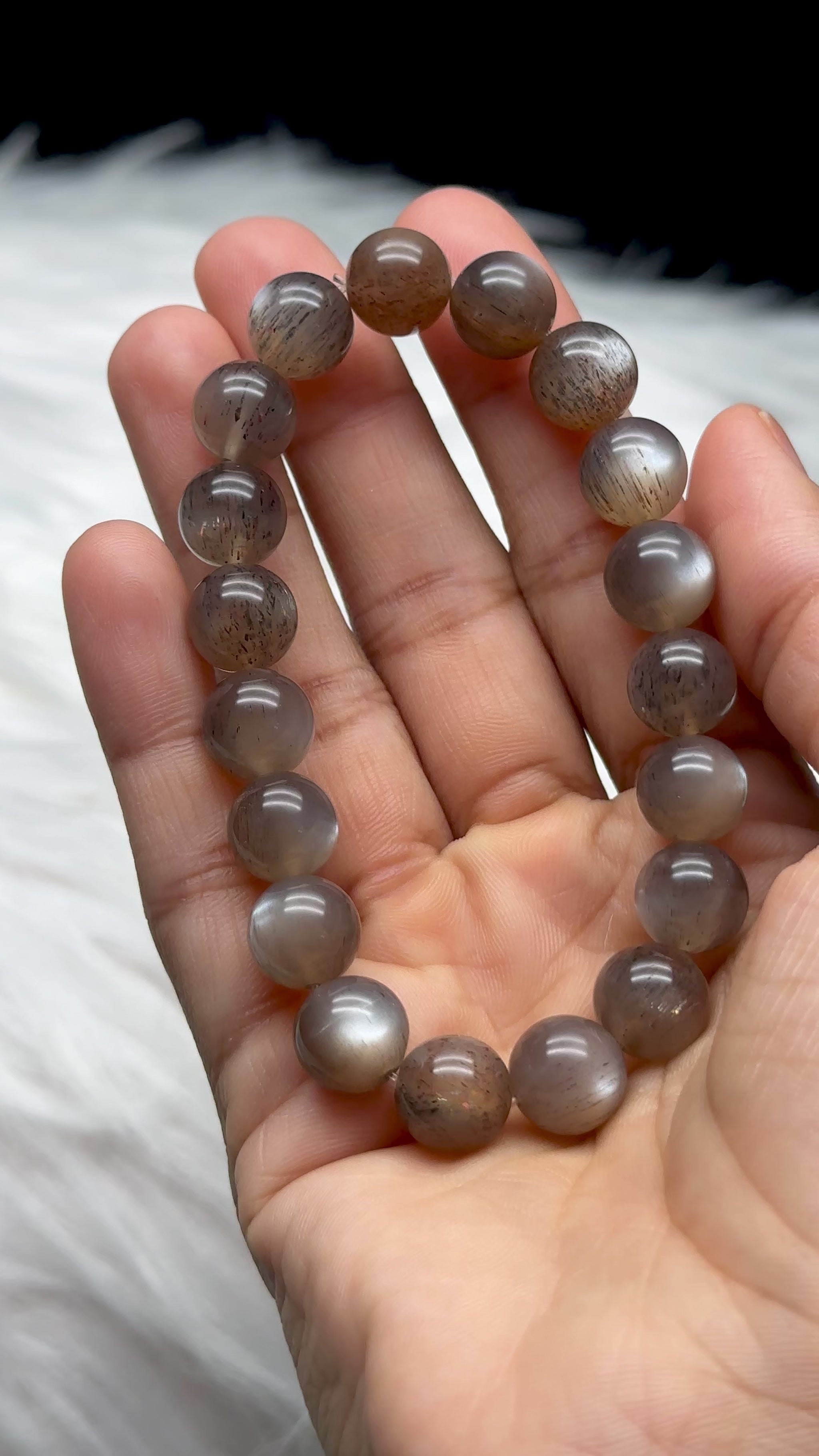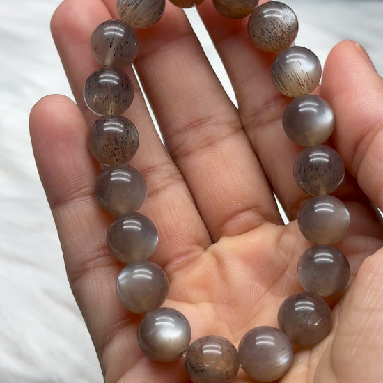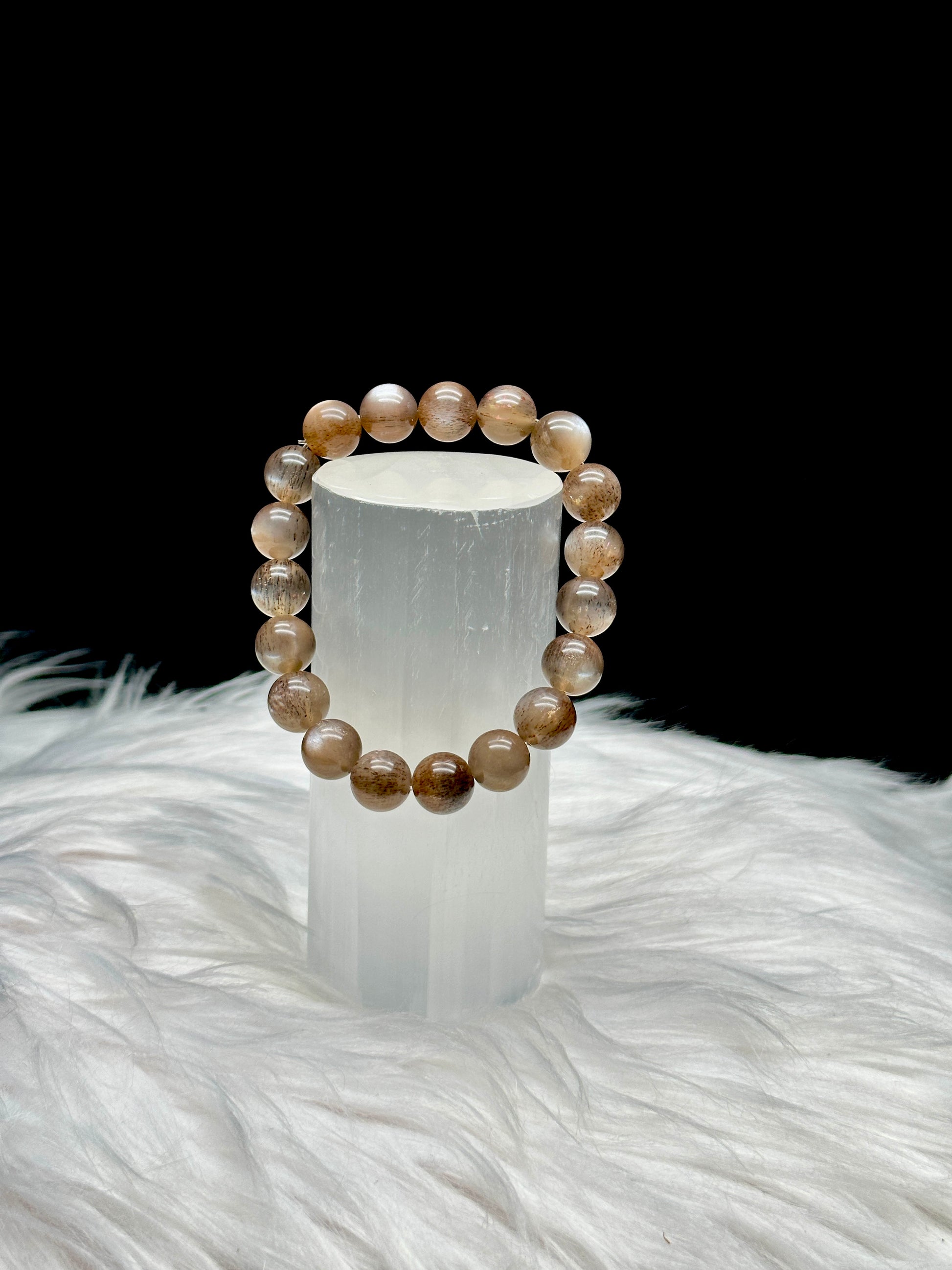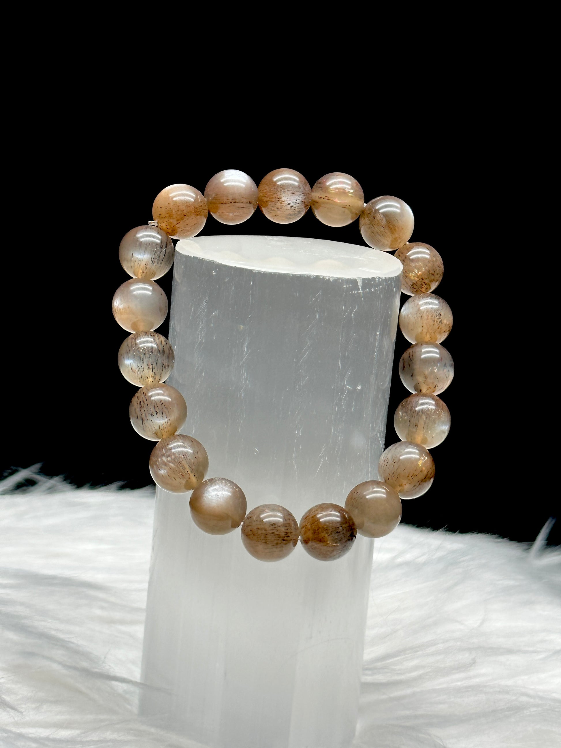 Super Rare Black Sunstone/Moonstone with Rutile Bracelet – 10mm Crystal Beads, Stretchable Cord