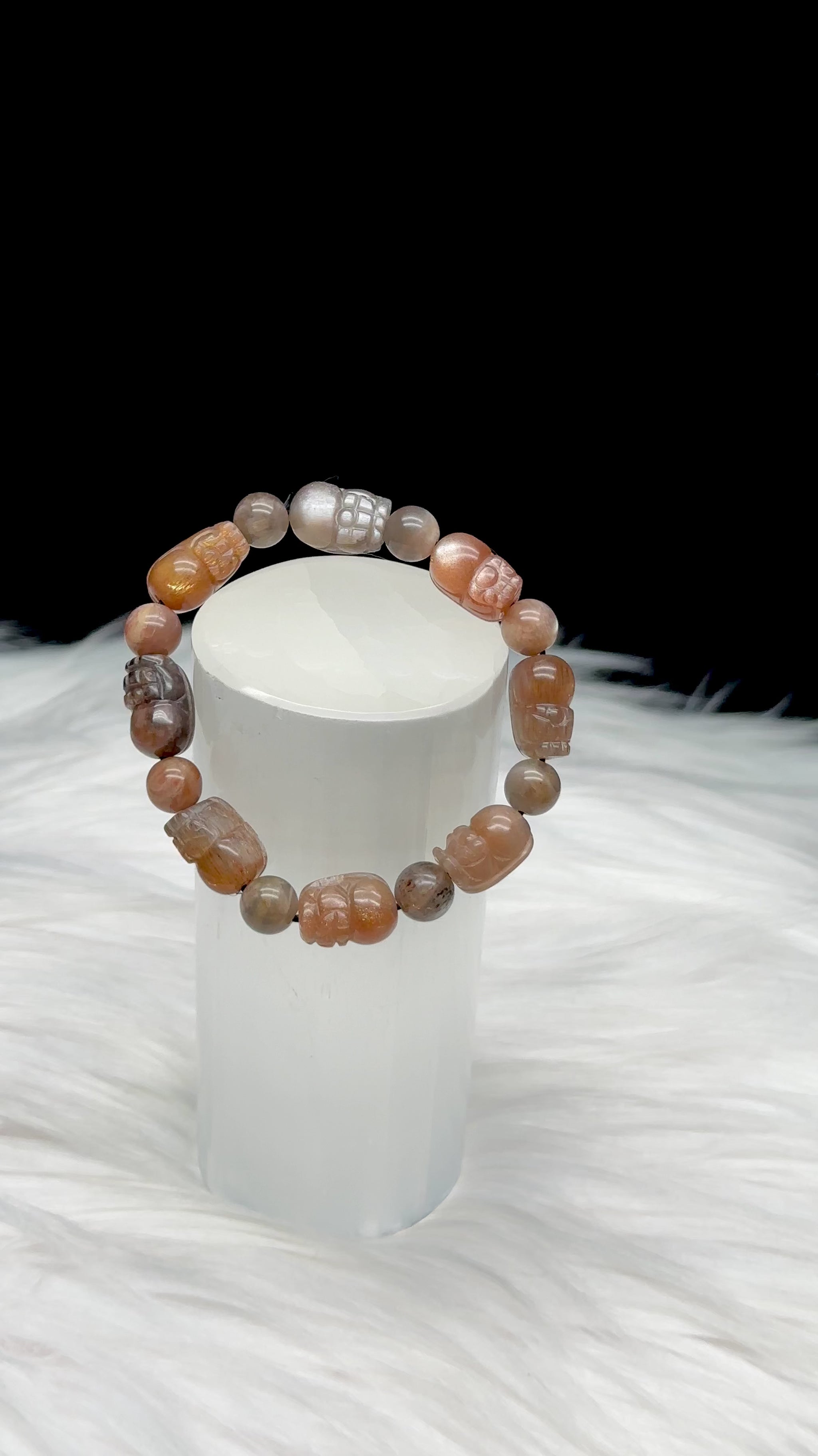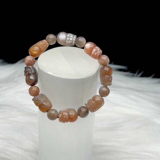 Super Rare Sunmoonstone with Rutile Pixiu Bracelet – Hand-Carved Beads, Stretchable Cord