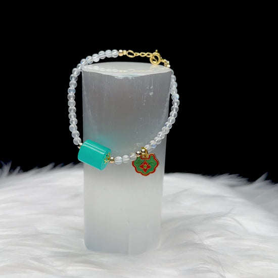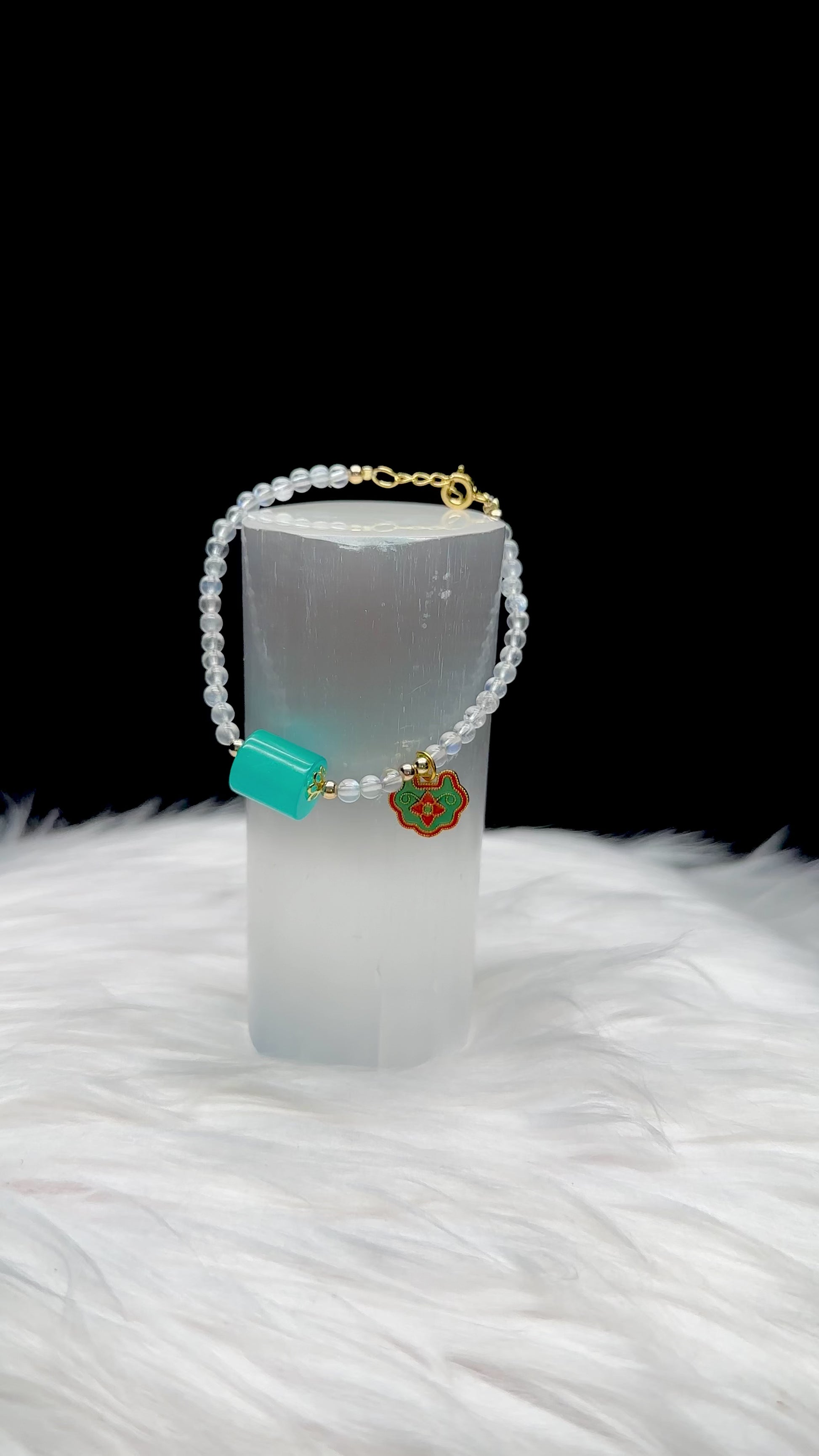 Invite calm, clarity, and spiritual harmony with this High-Quality White Moonstone Crystal Bracelet, featuring a serene Blue Amazonite center bead and a handcrafted Feng Shui sterling silver hanging charm. Designed with an adjustable sterling silver hook clasp, this bracelet blends spiritual symbolism with refined elegance—perfect for crystal lovers and energy practitioners alike.